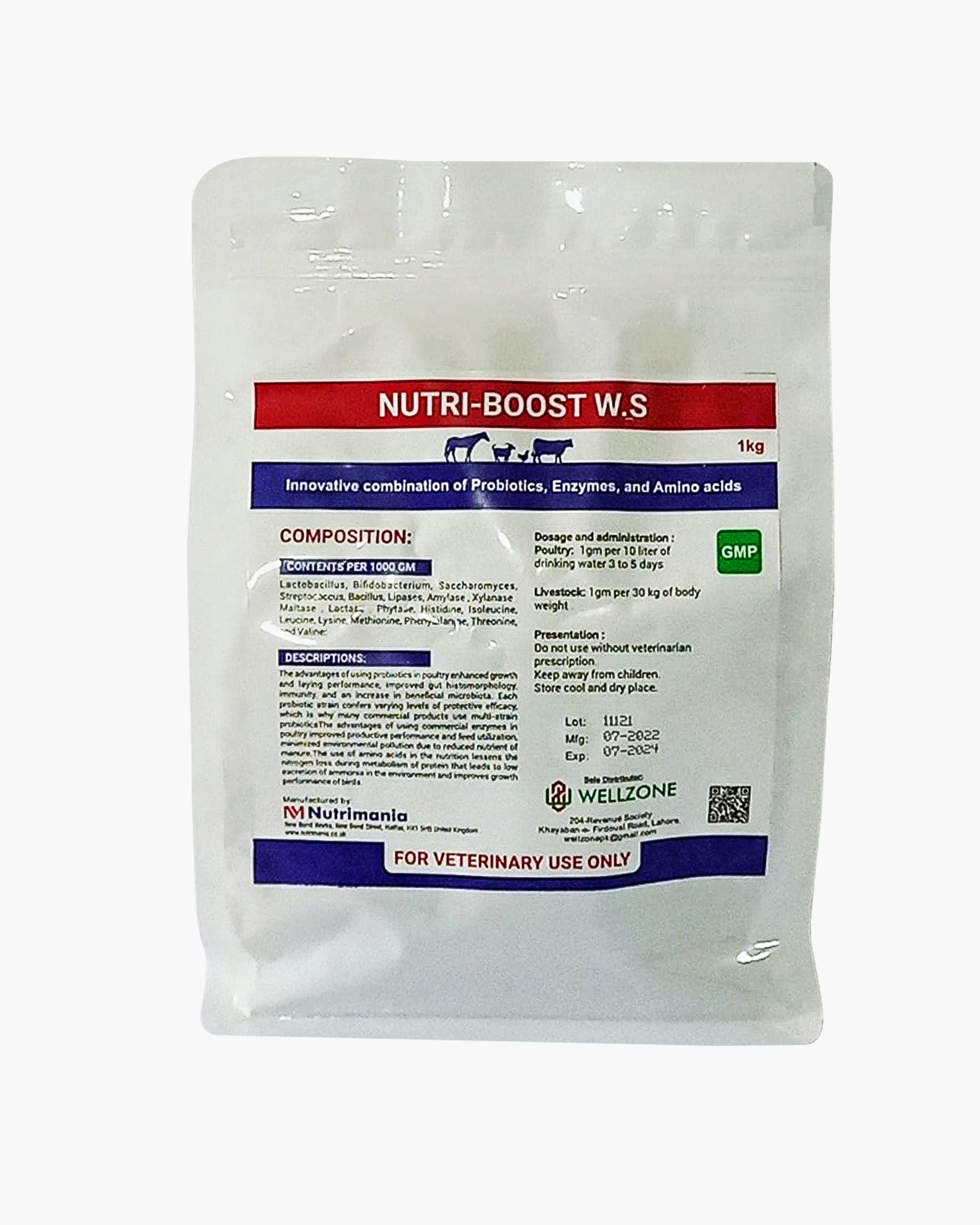Innovative combination of Probiotics, Enzymes, and Amino acids COMPOSITIONS: Lactobacillus, Bifidobacterium, Saccharomyces, Streptococcus, Bacillus, Lipase , Amylase , Xylanase , Maltase , Lactase , Phytase, histidine, isoleucine, leucine, lysine, methionine, phenylalanine, threonine, and valine: DESCRIPTIONS: The advantages of using probiotics in poultry enhanced growth and laying performance, improved gut histomorphology, immunity, and an increase in beneficial microbiota. Each probiotic strain confers varying levels of protective efficacy, which is why many commercial products use multi-strain probiotics The advantages of using commercial enzymes in poultry improved productive performance and feed utilization, minimized environmental pollution due to reduced nutrient of manure. The use of amino acids in the nutrition lessens the nitrogen loss during metabolism of protein that leads to low excretion of ammonia in the environment and improves growth performance of birds. DOSAGE: Poultry: 1gm per 10 liter of drinking water 3 to 5 days Livestock: 1gm per 30 kg of body weight . PRECAUTIONS: Do not use without veterinarian prescription Keep away from children Store cool and dry place